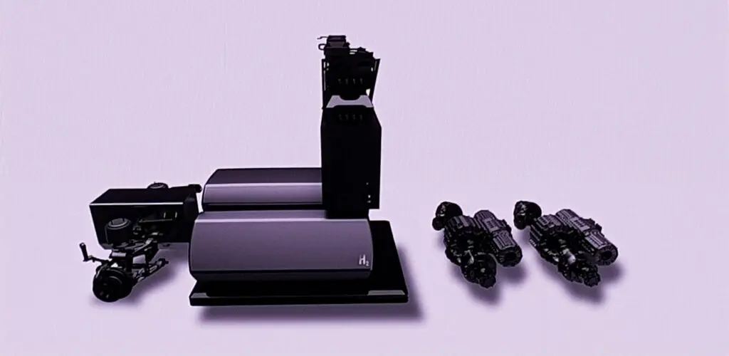 De enige afbeelding die we konden vinden van de aandrijflijn, met voorin een elektromotor, in het midden de waterstof tanks en rechts de e-axles.
