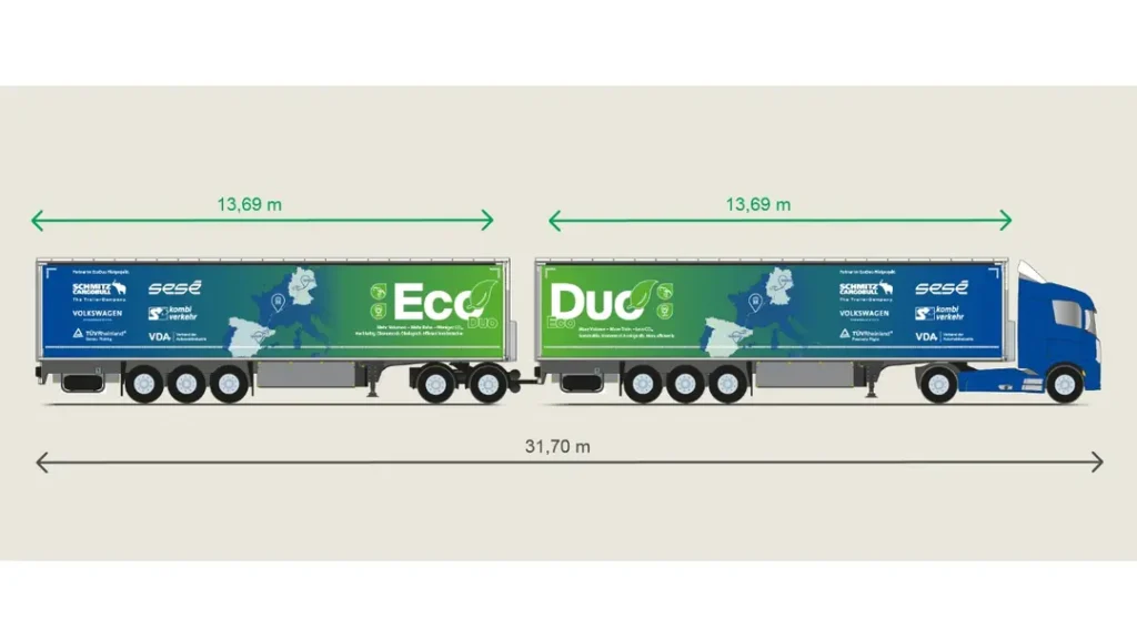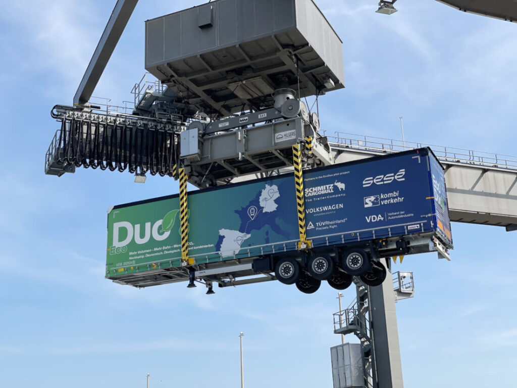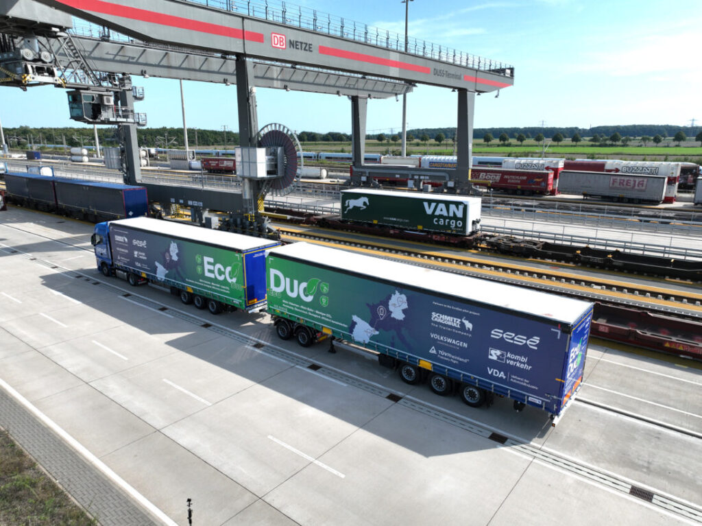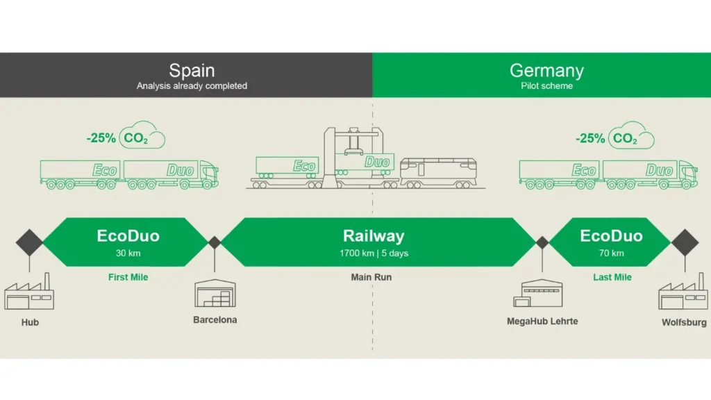 Voor het proefproject – onder leiding van de Vereniging van de Automobielindustrie – wordt de EcoDuo geleverd door de voertuigfabrikant Schmitz Cargobull. De Volkswagen Groep verzorgt de transportverbinding voor dit proefproject. Tot nu toe werden productiecontainers tussen Wolfsburg en Spanje alleen per vrachtwagen vervoerd. Nu rijdt de wereldwijde logistieke dienstverlener Sesé de EcoDuo van de Volkswagenfabriek in Wolfsburg naar de 70 km verderop gelegen terminal MegaHub Lehrte bij Hannover, die wordt geëxploiteerd door het Duitse overslagbedrijf Schiene-Straße und Kombiverkehr. Van daaruit worden de opleggers op 1.700 km per spoor naar Spanje vervoerd in het netwerk van Kombiverkehr KG. Op het overslagstation in Barcelona worden de afzonderlijke opleggers weer aan elkaar gekoppeld tot een EcoDuo combinatie en ook over de weg door Sesé naar de bestemming gereden. TÜV Rheinland ondersteunt het proefproject wetenschappelijk en vanuit het oogpunt van verkeerswetgeving.