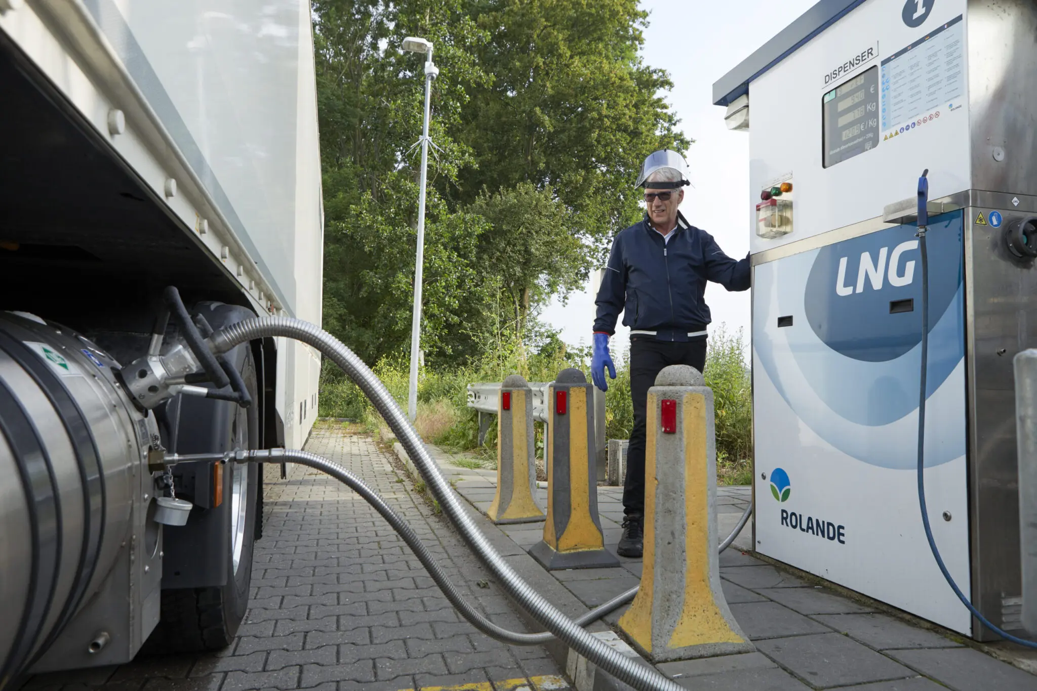 Omdat het ijskoude, vloeibare gas onder hoge druk staat, geldt bij het tanken van LNG een speciale procedure met dito lichaamsbescherming. Ga je als chauffeur met een LNG-truck op pad, dan zal je hiervoor eerst instructies moeten krijgen. Gewapend met handschoenen en een masker, gooit demochauffeur Johan Akkerman onze tank vol. We zijn klaar voor vertrek.
