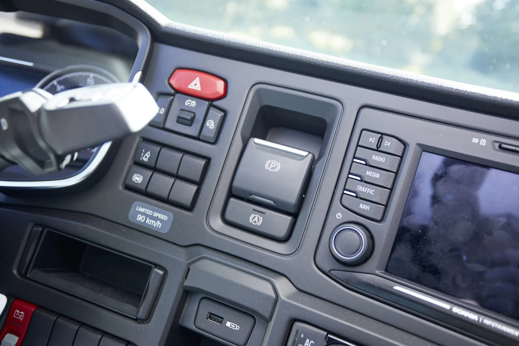 Tijdens de pauze heeft de standairco zijn werk gedaan en wij vervolgen onze weg in een aangenaam koele truck. We naderen een steile afdaling. Daarop gaat de retarder op standje maximaal, maar korte ingrepen met de voetrem blijken nodig om ‘m verder af te remmen. Dit gebeurt overigens ook wanneer ACC is ingeschakeld. Een gastruck heeft een beter rollend vermogen dan een dieseltruck, dus nog eerder het gas loslaten is de tip en blijkbaar lag onze aanvangssnelheid toch iets te hoog. We laten ‘m onderaan lekker rollen, zodat we ‘gratis’ vooruitgaan. Het is een geruststellende gedachte dat de snelheidsoverschrijding op de bestuurderskaart in deze Scania in principe tot het verleden behoort, want na 40 seconden overschrijding grijpt de retarder automatisch in.