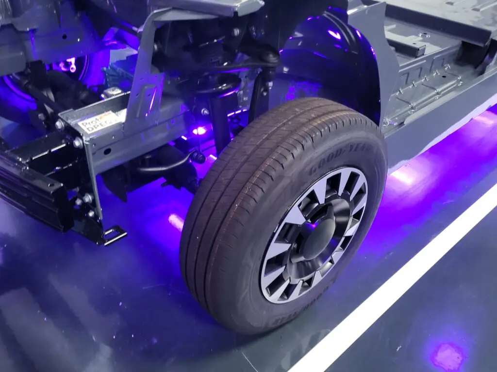 De Flexis-modellen hebben een ‘skateboard-platform’, of te wel alle aandrijving is weggewerkt onder de ‘vloer’ van de besteller. Dat zorgt voor een nagenoeg vrije opbouw van de bestelauto, of het nu een gesloten model dan wel een chassis-cabine betreft. We zien in het ontwikkelingslab van Flexis, in Villebon-sur-Yvette, net iets ten zuiden van Parijs, zo’n basisplatform, met duidelijk zichtbaar de motor op de achteras. Ook duidelijk zichtbaar is dat door het ontbreken van een motor bij de vooras, de voorwielen een veel grotere uitslag kunnen maken. Daardoor zullen de Flexis bestelauto’s een draaicirkel hebben van 10,3 m, vergelijkbaar met die van een Renault Clio.