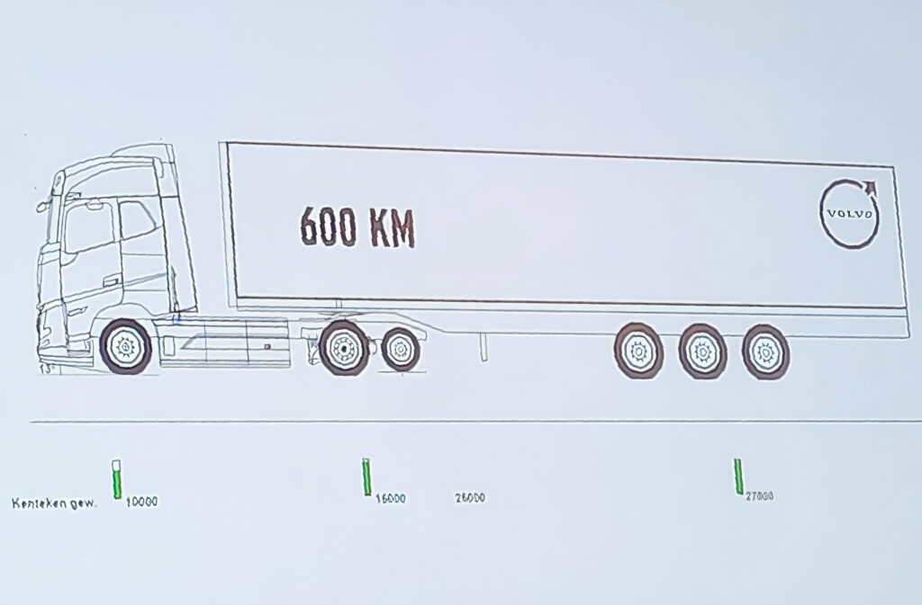 “De voordelen van de elektrische as zijn bekend”, vertelde Jan Schouten, manager energy transition bij Volvo Trucks tijdens de jaarlijkse persbijeenkomst, met als locatie logistiek dienstverlener CSE in Weert. “De elektrische as schept ruimte in het chassis, waardoor er meer accupakketten meekunnen. Maar meer zware accupakketten, goed voor 800 kWh, betekent ook een zwaarder voertuig en een hoger gewicht per as, iets dat soms bij de huidige versie van de FH Electric al kritiek is.” Daarom wordt de nieuwe FH Electric een 6×2 voertuig, met na de aangedreven e-as nog een gestuurde naloopas. “Daarmee wordt het gewicht evenwichtiger verdeeld”, aldus Schouten. “De naloopas is smal zodat hij goed onder de trailer past. Hij voldoet daarom aan de eis van de bestreken baan.”