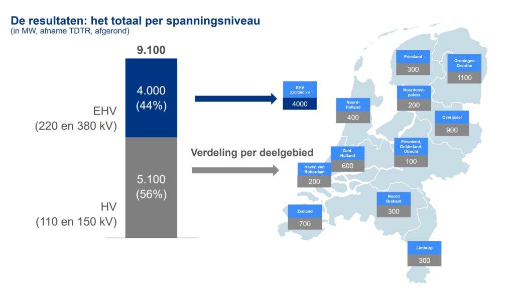 Tennet komt op basis van de nieuwe analyses tot de conclusie dat er 9,1 gigawatt aan restruimte op het net is die door TDTR-contracten ingevuld kan worden. Het gaat om 4 gigawatt ruimte op het 380.000 en 220.000 volt hoogspanningsnet en 5,1 gigawatt op het 150.000 en 110.000 volt hoogspanningsnet. De gevonden ruimte op de 150.000 en 110.000 volt hoogspanningsnetten zijn per provincie of regio onderverdeeld.