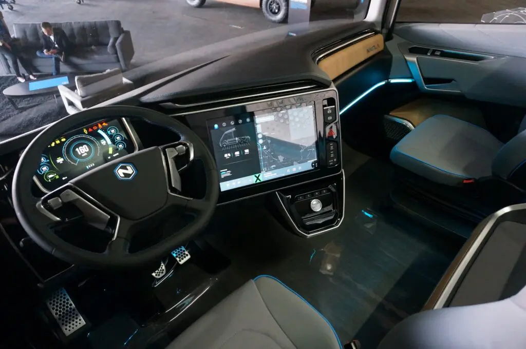 Daar doet Milton vrij makkelijk over, want het ontwerpen en bouwen van een truckcabine is zoals bekend een hele investering. Positief is dat Nikola heel veel investeerders achter zich heeft staan en blijkbaar voldoende cashflow heeft voor fikse uitgaven terwijl het nog geen trucks commercieel op de weg heeft. De op Nikola World met veel trots gepresenteerde cabine van de Tre is echter een echte conceptcabine, die er fraai uitziet maar waar nog veel logische zaken aan ontbreken. Een frontzichtspiegel bijvoorbeeld, en opbergruimte onder het bed. Een kijkje onder het zorgvuldig afgeschermde chassis biedt een blik op metalen rasters en hout. De Tre is dus nog niet klaar voor welke proef dan ook, toch wil Nikola al volgend jaar de truck in Noorwegen gaan testen. In 2023 moet de truck dan in productie gaan, eveneens in Europa. In Amerika gaat de Two, die we op Nikola World al wel rijdend konden zien, in 2022 in productie. Hulp bij de technische realisatie is er van gerenommeerde partners als Bosch en Wabco.