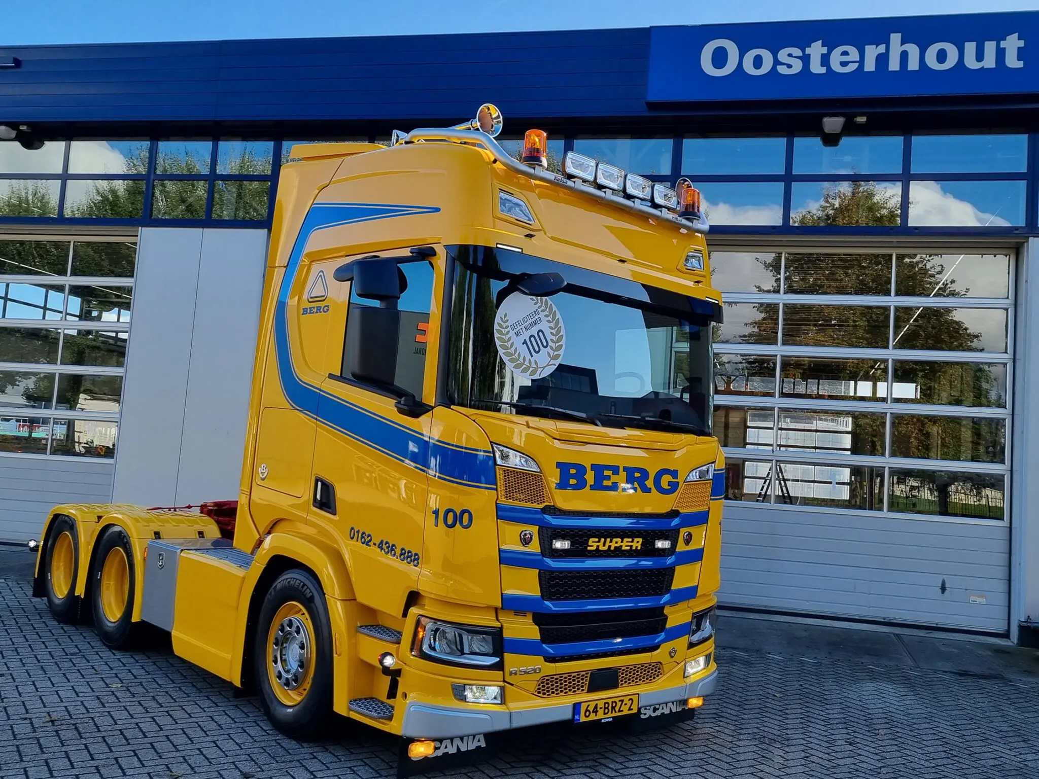 Van den Berg Transport & Montage is een logistieke dienstverlener voor de bouw en wegafzettingen. Het bedrijf nam afgelopen maand met een Scania 6×2 R520 V8 Highline zijn 100ste truck in gebruik sinds de oprichting in 1953. De truck is overigens de laatste van een bestelling van vier. Eerder dit jaar zijn er twee G450 voertuigen en een R520 geleverd.