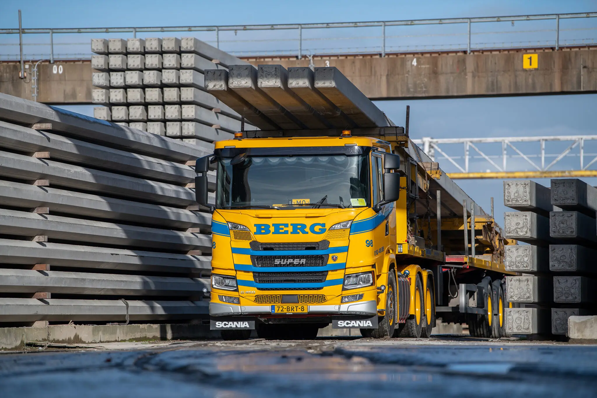 Van den Berg is gespecialiseerd in het transport van heipalen en kanaalplaten. “De palen gaan tot een lengte van 2 tot 40 meter, de kanaalplaten van 2 tot 20 meter. En ook zijn we actief in het transport van brugdelen en het aanleggen en weghalen van verplaatsbare stalen wegbarriers. Dat zijn tijdelijke afscheidingen die gebruikt worden bij wegwerkzaamheden.