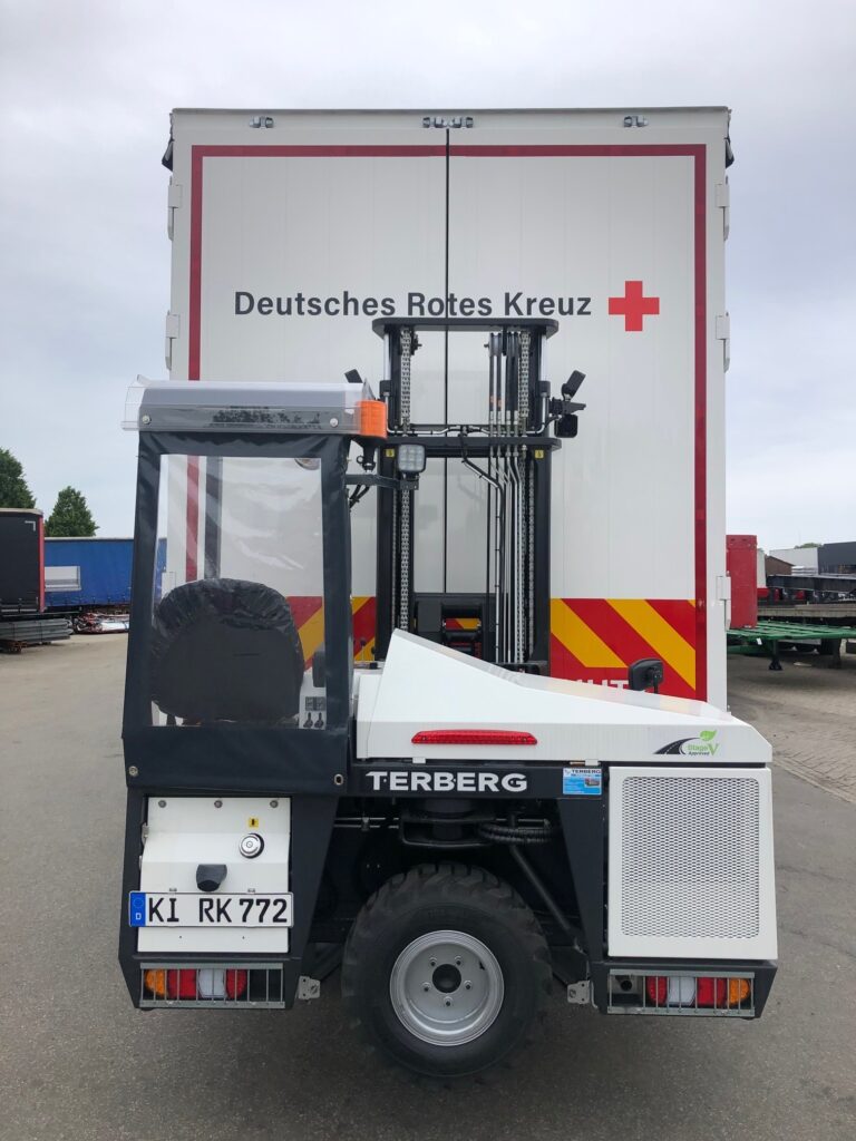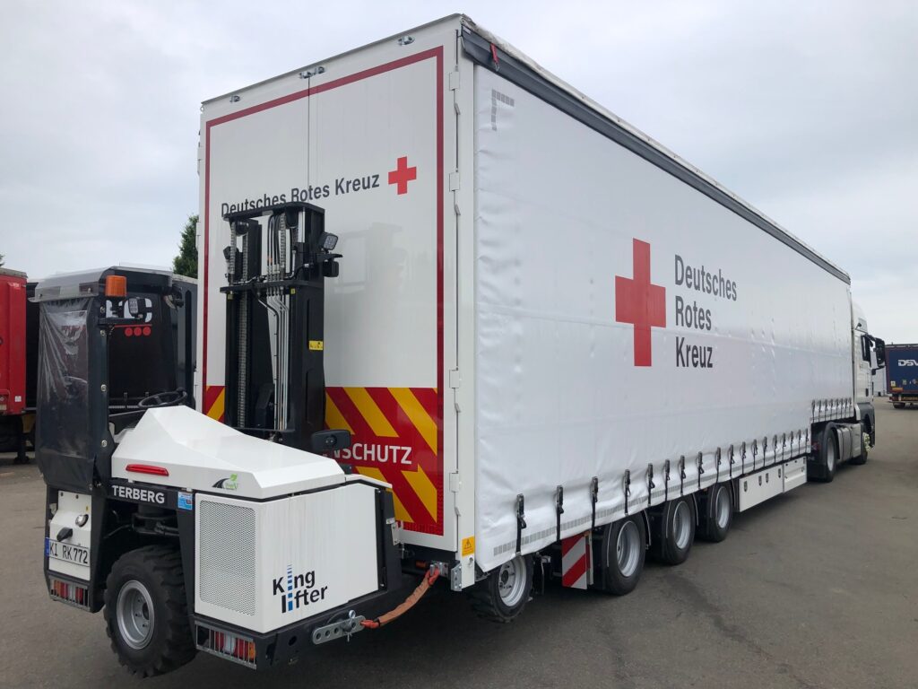 De witte huifopbouw van de nieuwe, drieassige Pacton semi-dieplader is voorzien van een groot, rood kruis met de benaming ‘Deutsches Rotes Kreuz’. Achterop de trailer dragen de deuren bovendien de tekst ‘Katastrophenschutz’. De achterzijde is tevens geschikt voor het transport van een – in dezelfde stijl uitgevoerde – King Lifter meeneemheftruck. Dat is voor een semi-dieplader weliswaar niet vaak gebruikelijk, maar voor de activiteiten van het Deutsches Rotes Kreuz wel een optie met voordelen.