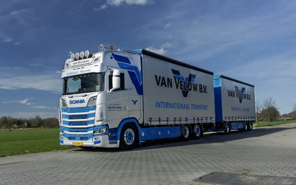 Transportbedrijf Van Veluw uit Barneveld is de maand maart wel heel bijzonder begonnen: de eerste combinatie ooit werd bij het bedrijf afgeleverd. Het gaat om een Scania S530 V8 met schamelaanhanger met schuifzeilen.