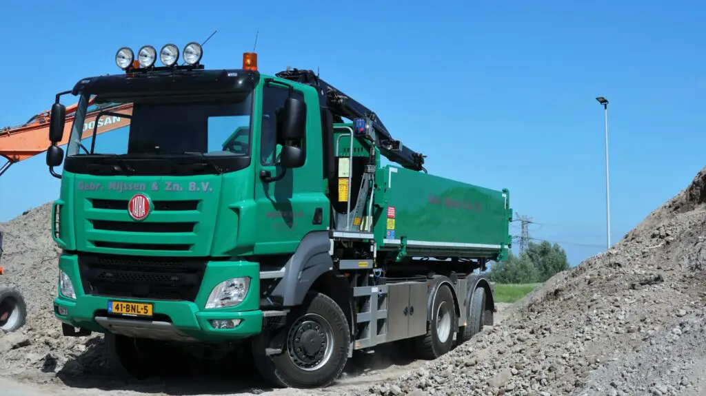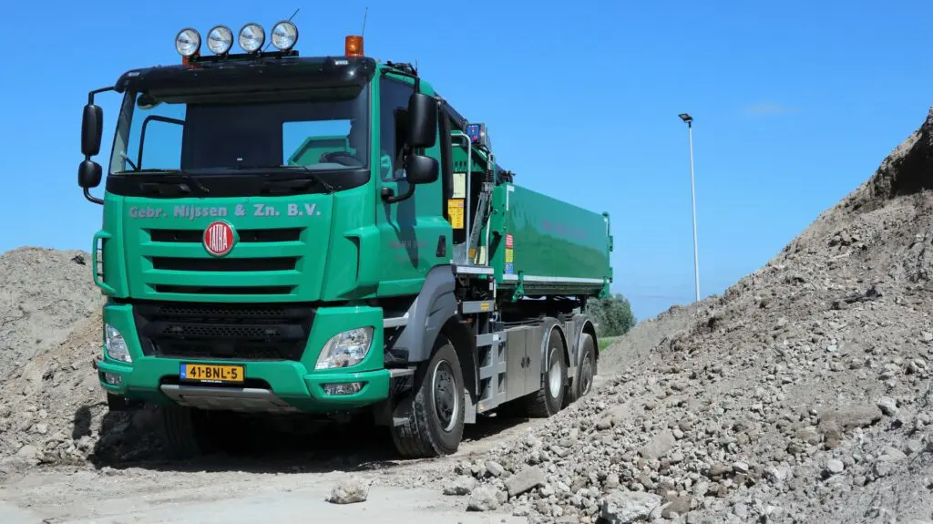“Voor het werk waren we op zoek naar een kipper met een gestuurd widespread tandemstel”, legt Jaap Nijssen uit. Hij staat samen met zijn neef Jaco en nicht Melissa op het punt om als derde generatie het ruim zestig jaar bestaande familiebedrijf over te nemen van vader en oom Arjan en Leo. “We hadden al een Iveco Trakker en twee Volvo’s rijden, waarvan er een is uitgerust met een later gemonteerde widespread. Dat wilden we nu ook, maar dan wel een ‘af fabriek’ -oplossing en met een dealer in de buurt voor het onderhoud. Dan neemt het aantal keuzemogelijkheden snel af. Na enig online zoekwerk kwamen we bij Tatra uit en zijn we ons gaan oriënteren. Tijdens de TKD kwamen we in contact met Gerrit van der Garde van Tatra Nederland. Wanneer je met hem over een bouwvoertuig spreekt, vallen vele anderen in het niet. Gerrit heeft alle specifieke kennis over waar een bouwvoertuig aan moet voldoen en kan ook heel specifiek adviseren. Dat praat voor ons ook een stuk makkelijker. Hij begreep echt precies wat wij bedoelden en zochten. De op de TKD gedemonstreerde 6×6 bleek technisch gezien aan alle wensen te voldoen. Alleen wilden wij een iets andere kipper en een voor de bak gemonteerde HMF Z kraan op de auto. Dat bleek geen probleem. Via onze vaste leverancier HSW in Weesp kon de auto exact naar wens opgebouwd worden tot wat het nu is. Een auto waar we echt al onze transporttaken mee kunnen verrichten. Op locatie laden en lossen van vrachten en hij is ook prima in staat om onze diepladers met machines van en naar de werken te rijden.”
