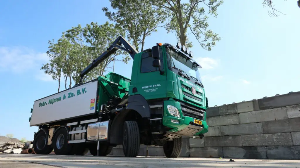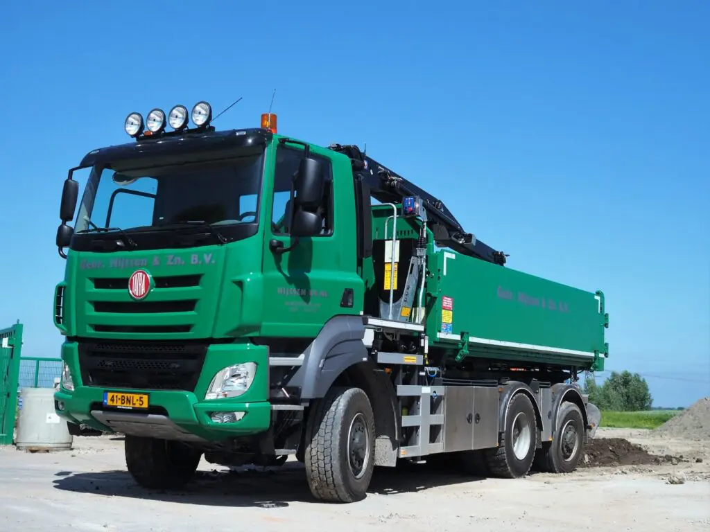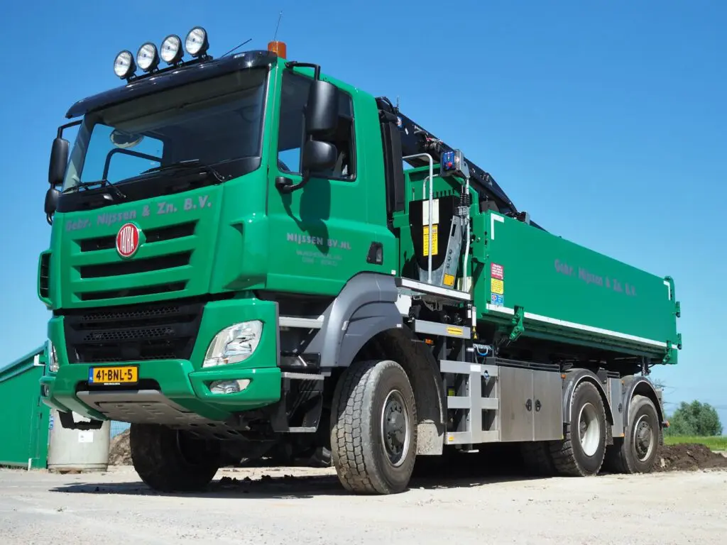 De nieuwste aanwinst van Gebroeders Nijssen uit Mijnsheerenland is een schitterende Tatra Phoenix PR 3335 met wide-spread opstelling. Tatra Nederland leverde dit voertuig met een 460 pk PACCAR motor en geautomatiseerde ZF TraXon 16 versnellingsbak. HSW in Weesp verzorgde de twee-zijden kipperbak met Multikap. Evenals de HMF 16.43, 16 ton-meter autolaadkraan en de nodige kisten onder de auto.
