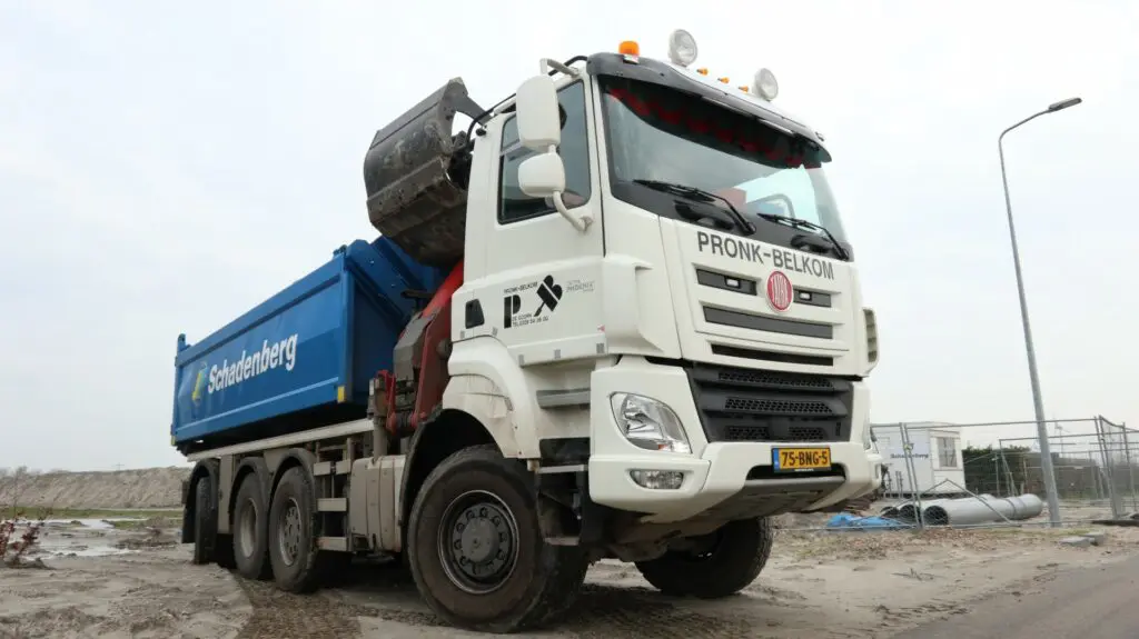 Het grootste deel van de transporten die familiebedrijf Pronk-Belkom verricht, is kieper/kraan gerelateerd. Men rijdt zand, grond, puin, asfalt en andere los gestorte goederen maar is ook met diverse voertuigen actief in de gladheidsbestrijding. Het werkgebied strekt zich uit over Noord-Holland, Zuid-Holland en Friesland. In de meeste gevallen gelden de Pronk-Belkom voertuigen als de ‘flexibele schil’ voor aannemers en andere vervoerders in de grond-, weg- en waterbouw. Niet zelden vervoeren zij achter de kippers ook een dieplader met de benodigde machines. Ook de onlangs aangeschafte DAF 4×2 trekker is een multifunctioneel inzetbaar voertuig. Zeker door de recent in gebruik genomen Fliegl-trailer met een horizontaal lossysteem. Een toepassing die ook op de vorig jaar door Truckland geleverde Ginaf is gemonteerd. Hans Pronk: “Wij lossen vaak zand in schuren van tulpenbroeierijen, maar ook in tunnels en op wegen met veel portalen. Dan is dit echt een prima oplossing!”