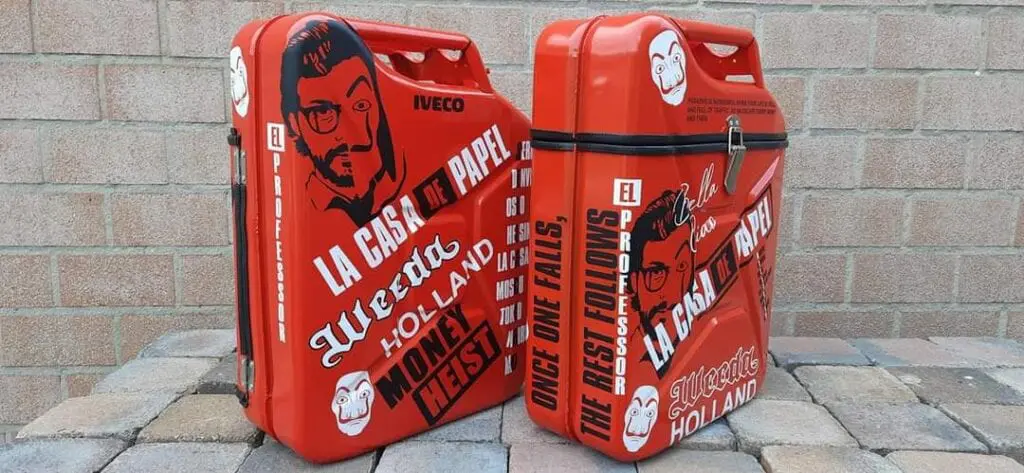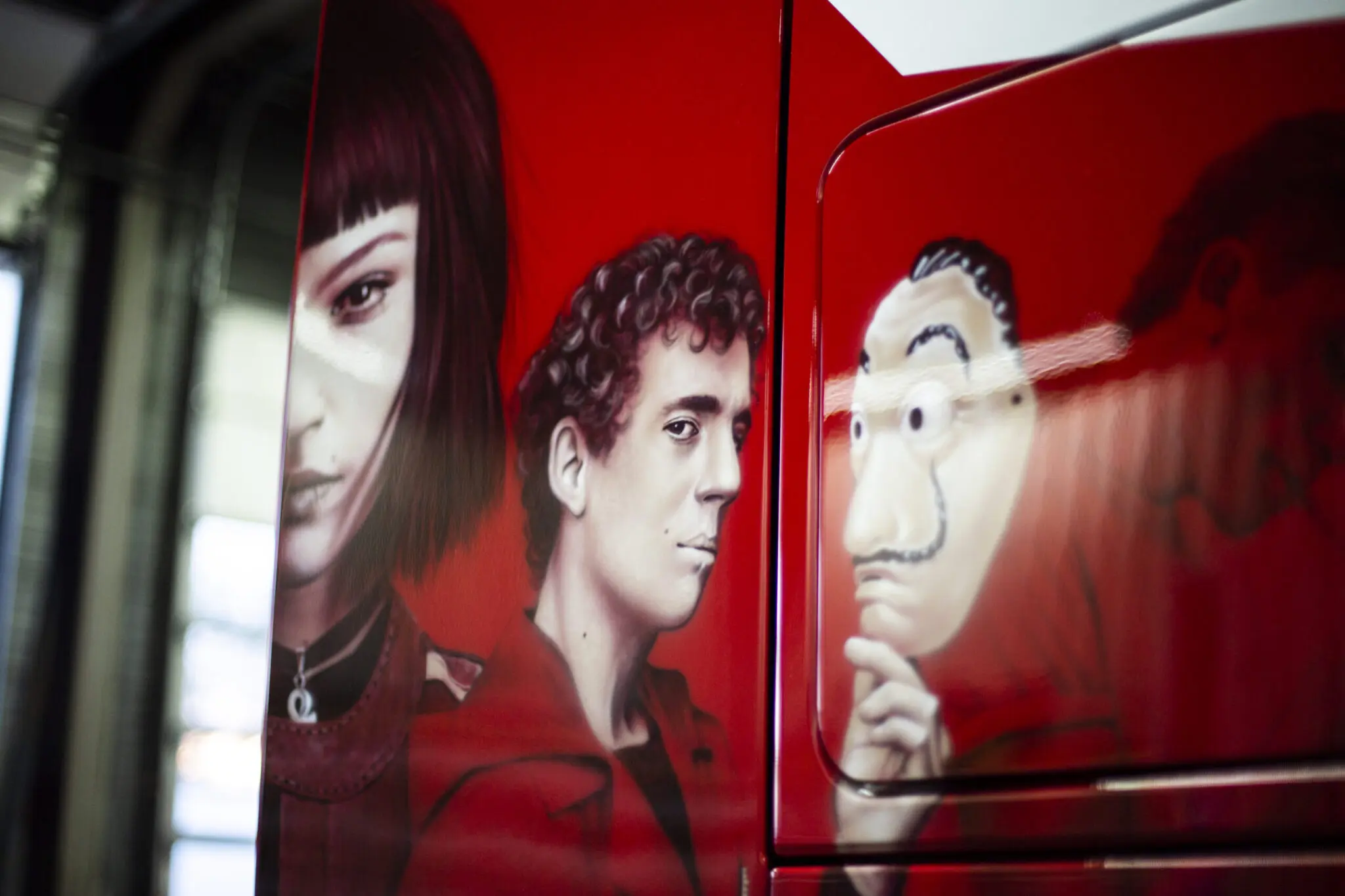 Daarna ging de truck naar MW Designs, dat op de bekende felrode basis de prachtige special-paint-afbeeldingen aanbracht op de achterwand, de zijkanten, het chassis en zelfs de spiegels. Net als de andere auto’s van Weeda kreeg ook de Iveco S-Way een thema mee uit de misdaadhoek. Het bedrijf koos namelijk eerder al voor Penoza en Escobar. De Iveco S-Way werd gewijd aan de Spaanse Netflix-serie La Casa de Papel. Hierin laten acht bankrovers zich met een aantal gijzelaars opsluiten in de Koninklijke Munt van Spanje. Om verwarring bij de politie te zaaien, draagt iedereen een rode overall en een Salvador Dali-masker. Zo weet niemand wie een gijzelaar is en wie een bankrover. Verder gebruiken de bankrovers niet hun eigen naam, maar die van steden. Vandaar de stadsnamen op de achterwand van de Iveco. Daar staat ook levensgroot een van de bankrovers afgebeeld. Of is dat misschien toch een gijzelaar?