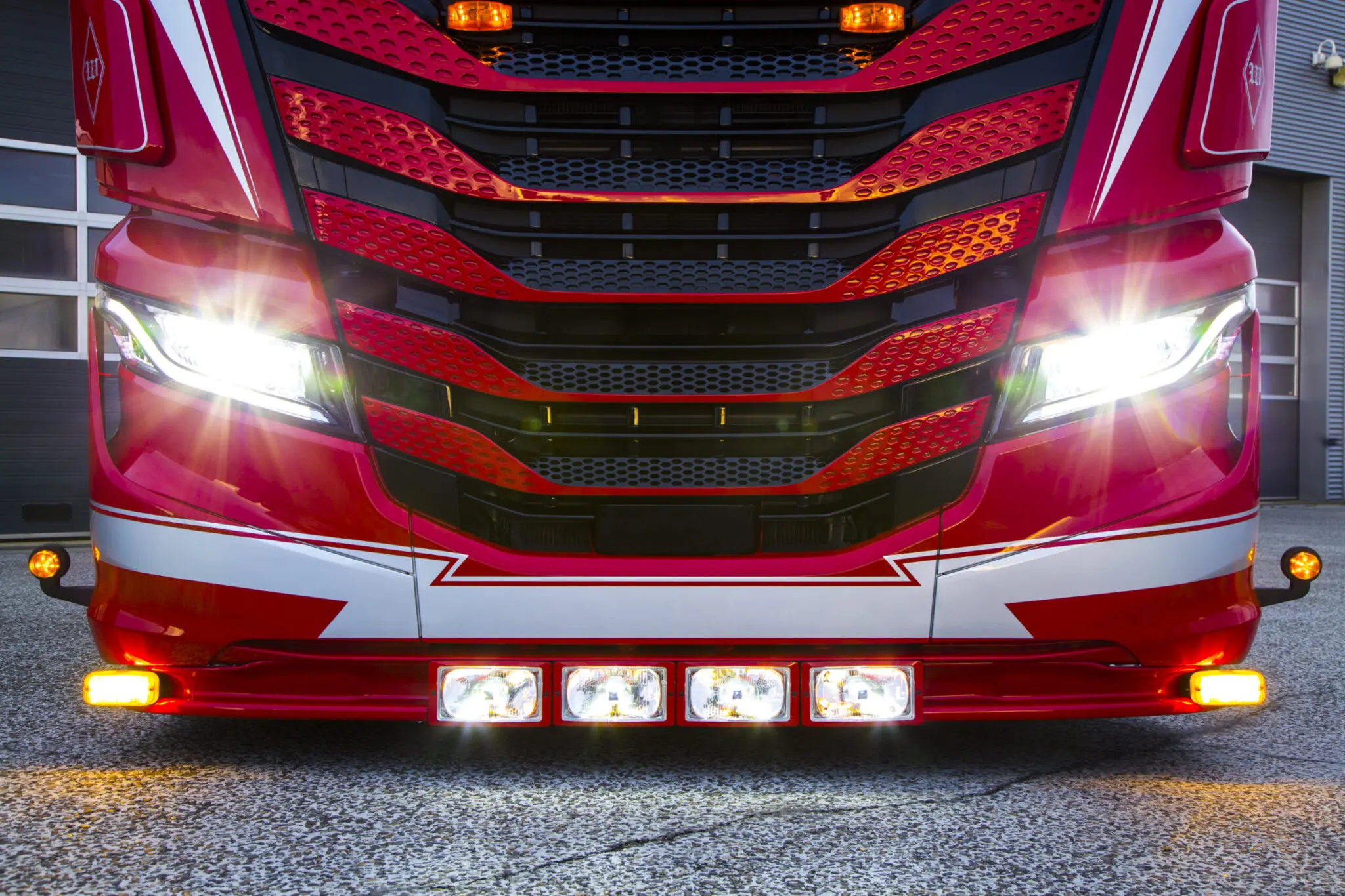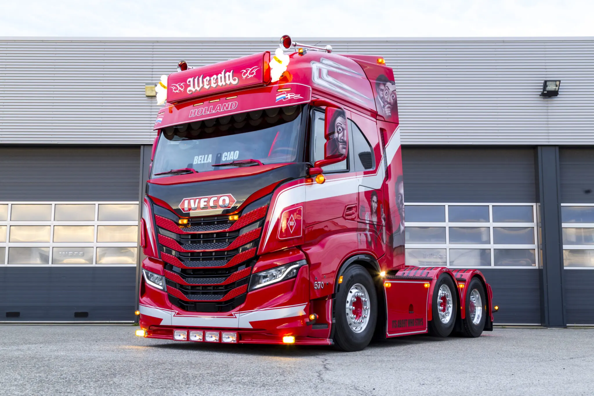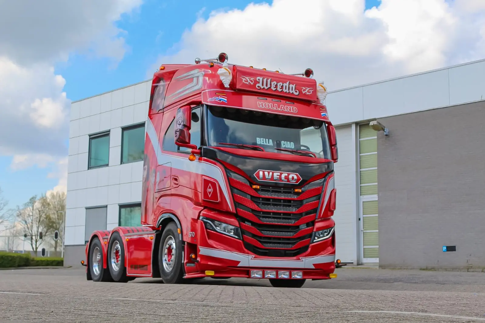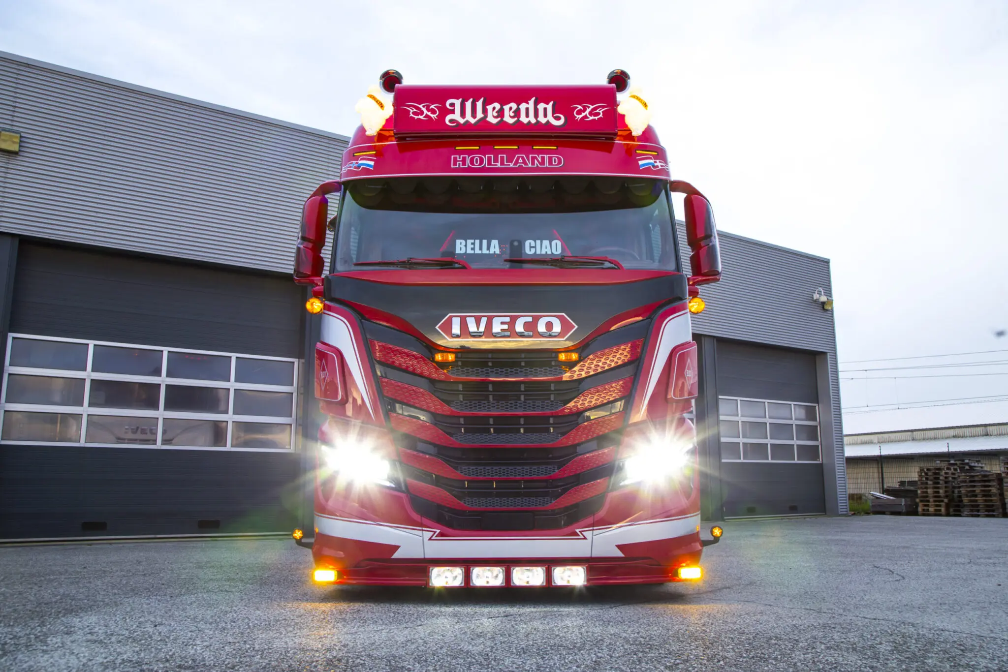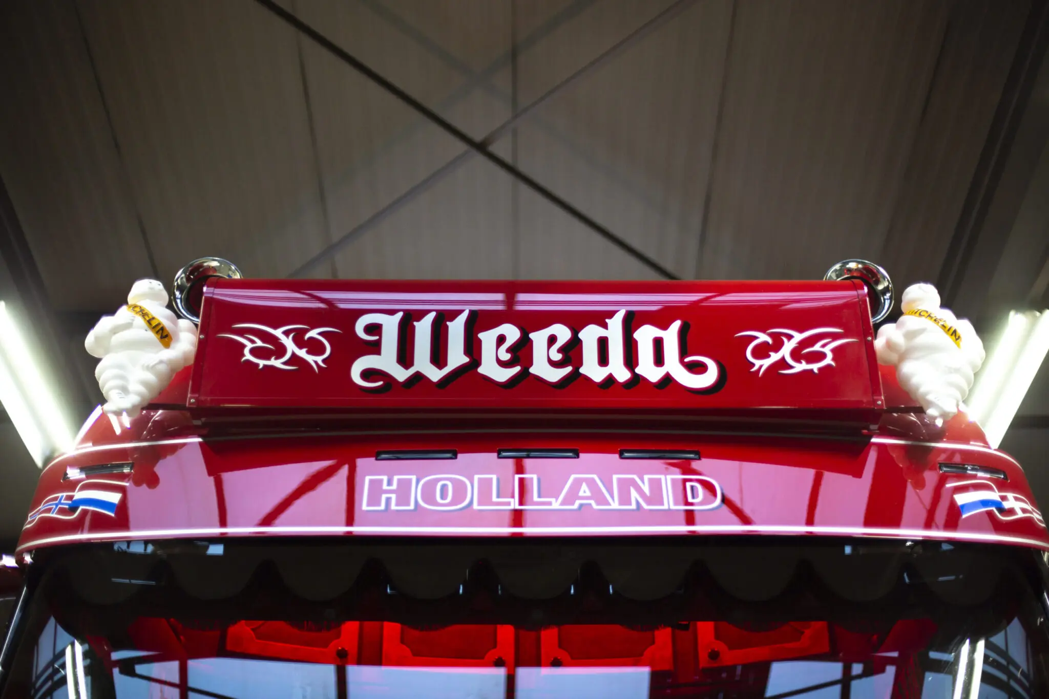 De opvallende trucks van Weeda zijn bekende verschijningen in de wereld van de showtrucks. Het transportbedrijf uit Klundert koos voor een Iveco S-Way 6×2-voorloopastrekker met 570 pk. Die as-configuratie is handig vanwege de aslasten in het containerwerk, dat een groot deel van de werkzaamheden bij Weeda uitmaakt. De trekker werd vervolgens naar Sjaak Kentie gestuurd om het chassis dicht te bouwen. Dat klinkt gemakkelijker dan het is, want dit is de eerste Iveco die zo’n complete metamorfose onderging. Het chassis werd dichtgemaakt met stalen platen aan de zijkant en een volledige traanplaat bovenop die zelfs tussen de twee achterschermen doorloopt. Aan de achterzijde kwam een Deense bumper met bloklampen en een handige extra opbergkist. Twee LED-bars links en rechts geven voldoende licht bij het manoeuvreren. Een mooi staaltje vakmanschap is het rek waaraan de verticale uitlaten zijn gemonteerd. Daar is nu een grote W te zien, waartussen heel netjes de aansluitingen voor de slangen zijn aangebracht. Daarachter kwam een volledig gladde achterwand. Aan de voorkant monteerde Kentie een extra spoiler onder de bumper met vier verstralers. Verder werd de opbouw eigenlijk vrij rustig gehouden, met een lichtbak, twee luchthoorns, Michelin-poppen en toplampen.