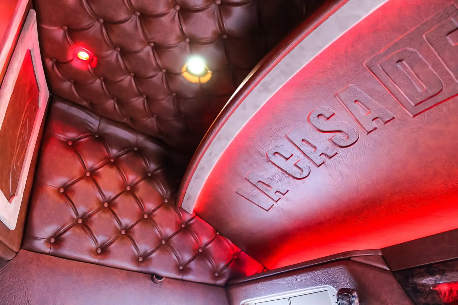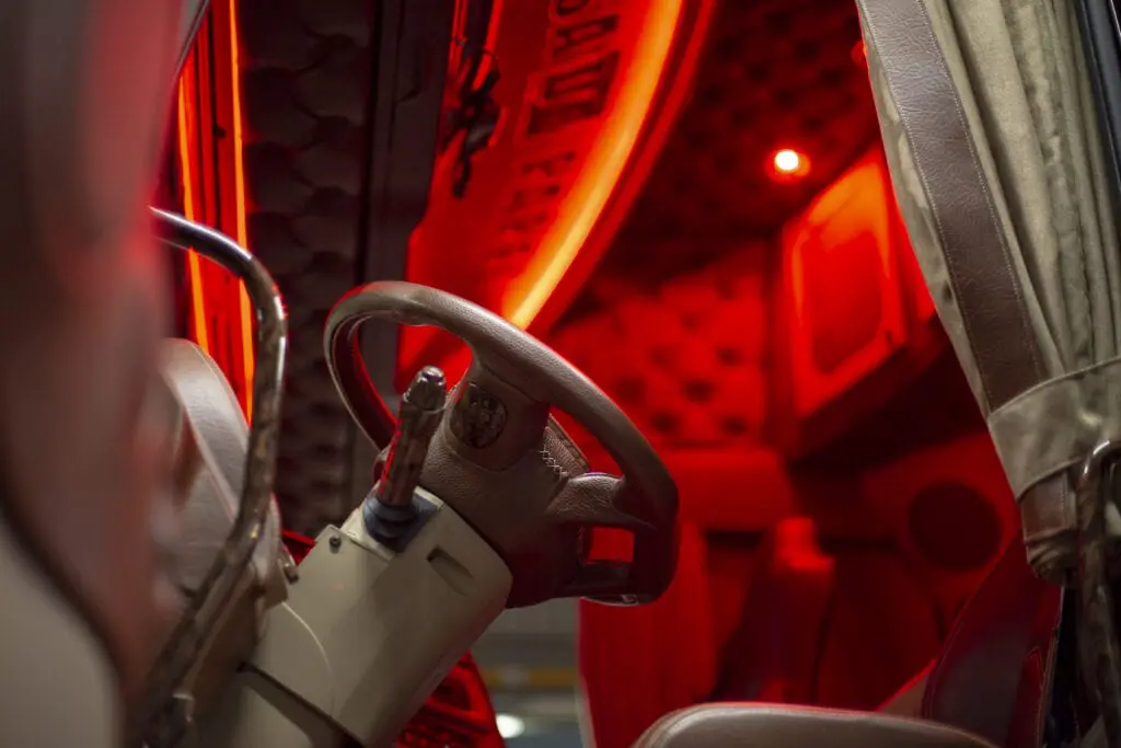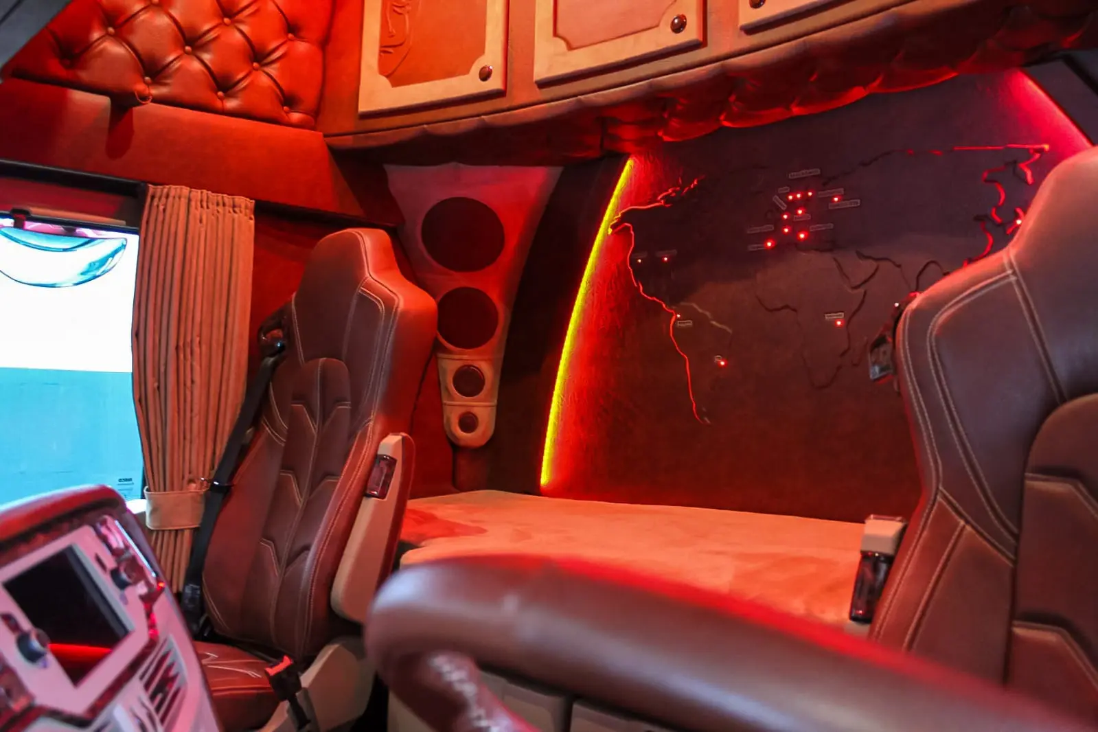 De specialisten van M&M Truck Design mochten zich vervolgens uitleven op het interieur. Daarbij werd echt alles aangepakt. Interieurdelen werden gespoten, schakelaars en panelen gedipt met houtmotief en de rest is voorzien van chic donkerbruin leer. Het moest vooral de sfeer hebben van een bruin café. In de achterwand werd in leer een wereldkaart aangebracht, met LED’s bij de steden die de criminelen als naam gebruiken. Een waar huzarenstukje is het halfronde bovenste bed, dat is verplaatst naar boven de voorruit. Aan de onderzijde van het bed prijkt de naam van de serie, La Casa de Papel. Ook over het geluid valt niets te klagen, want op diverse plekken zitten flinke luidsprekers voor de favoriete muziek van de chauffeur.