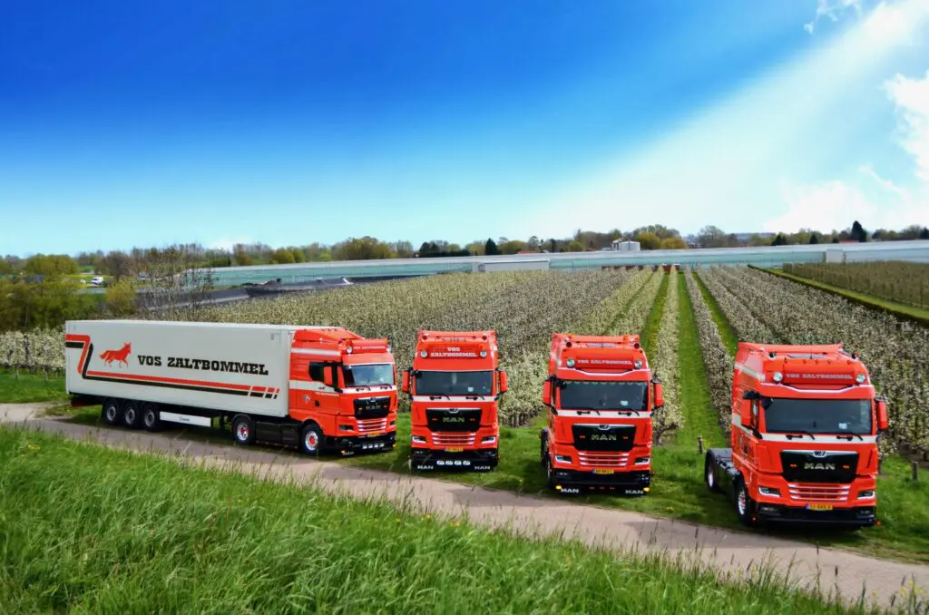 Met de komst van de 100e MAN-truck is het wagenpark van Vos Transport verder uitgebreid. “We hebben inmiddels 42 eigen vrachtwagens, de helft daarvan is MAN”, vertelt Roelof Oomen. Daarnaast zijn er 10 tot 15 vaste charters en 85 eigen opleggers. “We hebben door de jaren heen alle grote fabrikanten wel gehad, tot het punt dat we vijf verschillende merken door elkaar reden”, aldus Aart Vos.