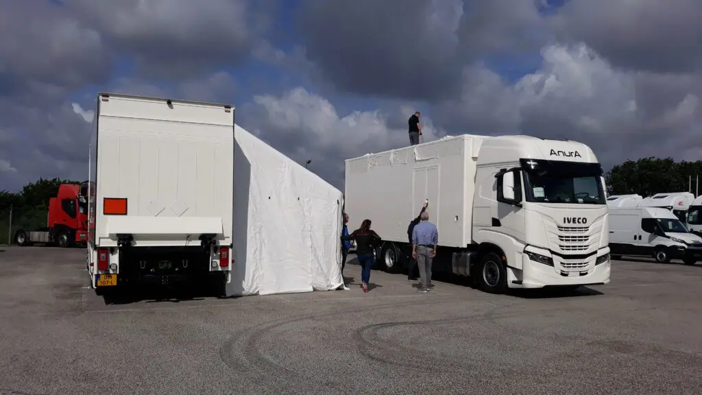 De duiktrucks zijn ook voorzien van een ingebouwde opblaasbare zijtent die je vanaf beide voertuigen aan elkaar kan ritsen. In die tent kunnen de duikers bij slecht weer nog steeds hun duikuitrusting comfortabel aan- en uittrekken.