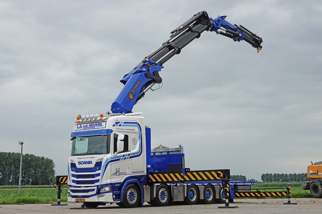 Speciaal transportbedrijf L.A. van den Heuvel uit Werkendam nam onlangs zijn nieuwe 10×4*6 Scania 540S in gebruik. De truck is zeer multifunctioneel geconfigureerd met zowel een 172 ton/meter kraan als een verlengbare laadbak én een afneembare schotel. Dat stelt wel heel hoge eisen aan het chassis en de assen. Dat was één van de belangrijkste reden waarom Van den Heuvel voor Scania koos.