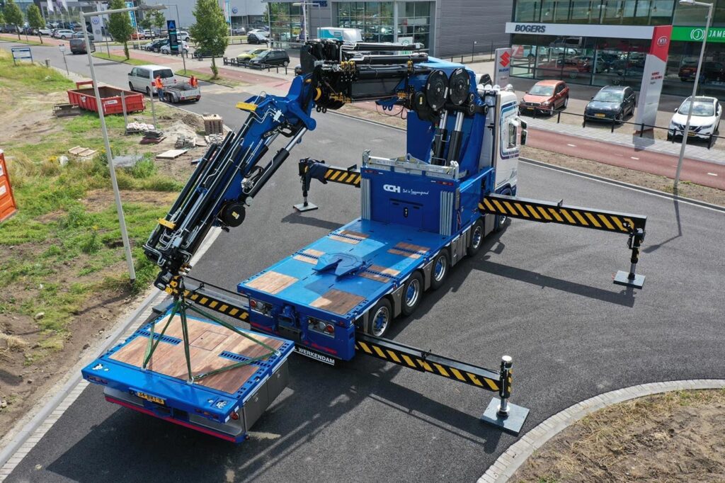 In de praktijk gaat de bakwagen net zoveel trekken en transporteren als hijsen. “Soms zijn het combinatieklussen. Maar heel vaak vervoeren wij ook alleen bijzondere ladingen. Dan kan er achter deze Scania meteen een dieplader op de schotel. Maar de schotel is ook afneembaar. Zodat we achter de kraan ook een korte laadbak kunnen plaatsen van 4,5 meter lang. Via een vangmuilkoppeling kan er dan een aanhanger achter. Maar als dat niet genoeg is, kunnen we de laadbak nog met 1,5 meter verlengen door er een stuk aan te koppelen met een tweede vangmuilkoppeling. Dan hebben we zes meter laadvloer en kunnen we bijvoorbeeld ook een 20 voet container meenemen en daarachter nog weer een aanhanger.