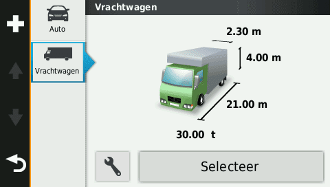Het navigatiesysteem is uitgerust met speciale functies voor vrachtwagens zoals een aangepaste truckroutering afhankelijk van de grootte en het gewicht van de vrachtwagen, routewaarschuwingen in verband met de hoogte van bruggen en viaducten, maximale gewichtsgrenzen, scherpe bochten, steile