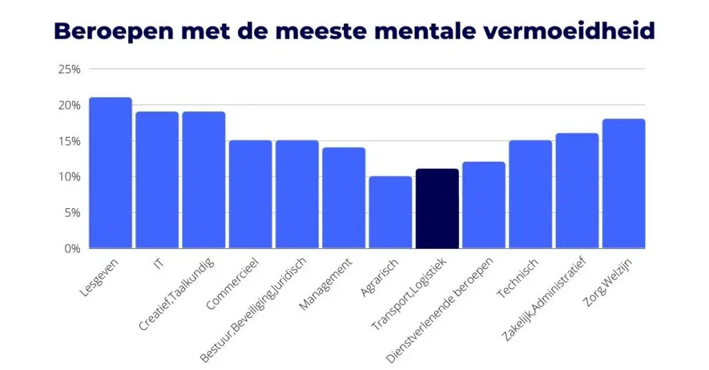 Deze cijfers worden ondersteund door een ander onderzoek over mentale vermoeidheid in verschillende banen. In 2020 heeft 16 procent van alle medewerkers gemeld dat ze een aantal keer of zelfs regelmatig per maand vermoeid of oververmoeid waren vanwege hun werk.