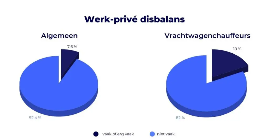 Banen in de transportsector worden niet alleen beïnvloed door de consequenties van digitalisering, het CBS suggereert dat veel werknemers in deze industrie vermoeid zijn vanwege hun baan. Het CBS heeft onderzoek gedaan aan het eind van 2020 om te zien welke banen een slechte balans tussen werk en privé vormen. Van alle werknemers die ze ondervraagd hebben, gaf 7.6 procent aan dat ze regelmatig een disbalans tussen werk en privé ervaren. Opvallend is dat 18 procent van de vrachtwagenchauffeurs aangeeft dat ze vaak of heel vaak een disbalans in hun werk-privéleven ervaren. Dat betekent dat de vrachtwagenchauffeurs in vergelijking met alle beroepen onderzocht, 237 procent vaker een werk-privé disbalans ervaren.