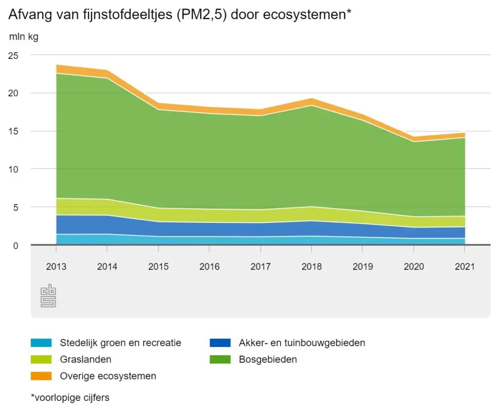 In 2021 ving de Nederlandse natuur 14,9 miljoen kilogram fijnstof (PM2,5) af. In 2013 was dit nog 23,8 miljoen kilogram. Sinds 2013 is de fijnstofafvang door de natuur dus gedaald met 37,5 procent.
