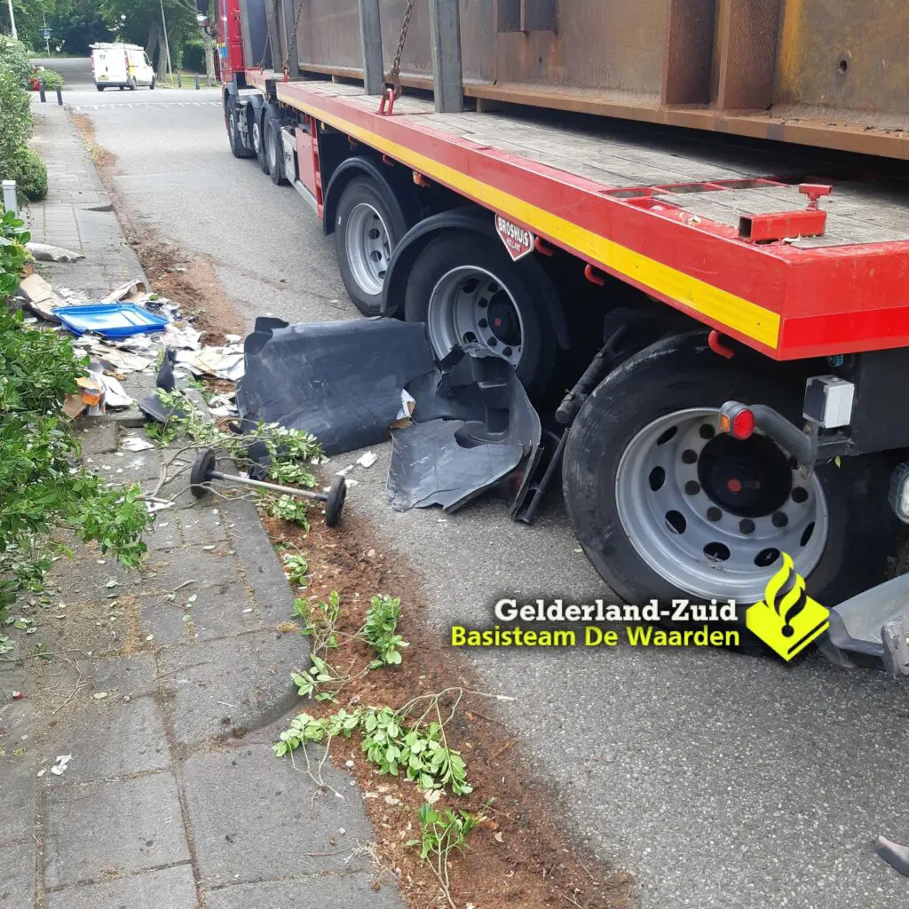 Het was een beetje een rommeltje maandagmorgen op de Stationsweg in Geldermalsen toen de meesturende assen van een met 30 ton staal geladen oplegger de verkeerde kant op stuurden.