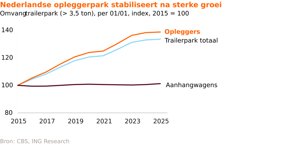 De Nederlandse trailervloot groeide in tien jaar tijd met 35 procent, maar is in 2024 voor het eerst gestabiliseerd op circa 178.000 opleggers. Door fiscale voordelen blijft Nederland aantrekkelijk als registratieland, maar door stagnatie in de nieuwverkoop, inmiddels onder het 10-jaarsgemiddelde, neemt de vernieuwing van het park af. Daarbij wordt nog veel ouder materieel vastgehouden, mede door lage inruilwaarden en de rol van trailers als flexibele opslag.