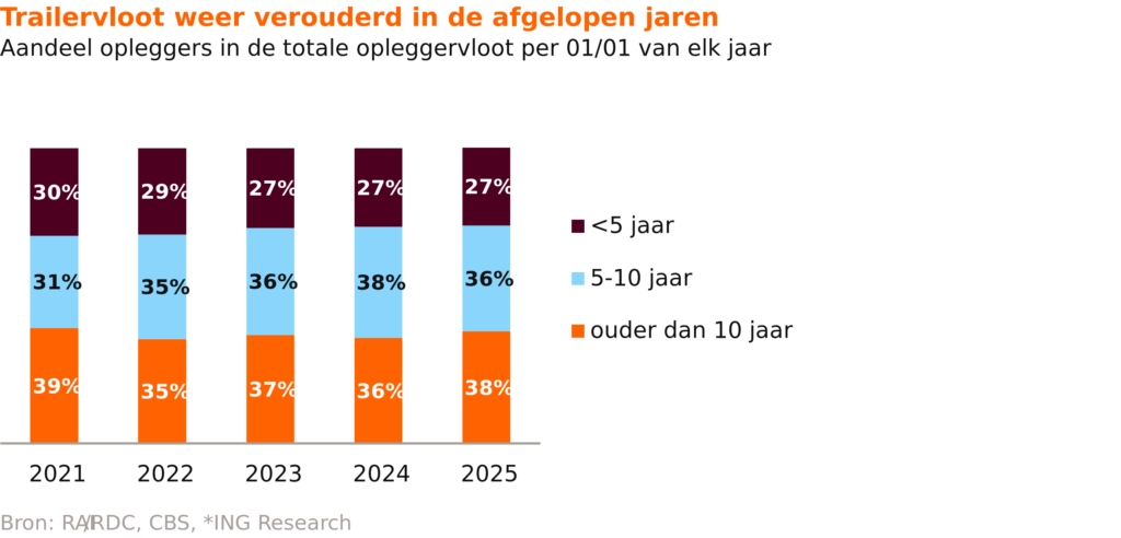 Ondanks de goede jaren 2022 en 2023 veroudert het trailerpark gestaag. Het aandeel opleggers ouder dan tien jaar is gestegen naar 38 procent, terwijl het percentage jonger dan vijf jaar op 27 procent blijft steken. Refurbishment is minder populair door lagere staalprijzen, hogere onderhoudskosten en een krappe arbeidsmarkt. Nieuwe trailers zijn weer aantrekkelijker, zeker bij koeltrailers waar het vervangen van dieselmotoren een kostentechnisch breekpunt vormt.
