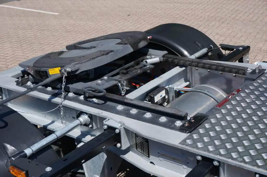 Van Setten Transport ging aan tafel met Truck & Trailer Groep Gomes, LeciTrailer en Van Ginkel Trucks en samen kwamen ze uit op de oplossing: een dolly met een verstelbare trekboom en een gestuurde naloopas. De wielbasis is twee meter en de dolly weegt 2660 kg. Niet alleen de trekboom is verstelbaar, de schotel is ook te verschuiven voor een optimale afstelling van de combinatie.