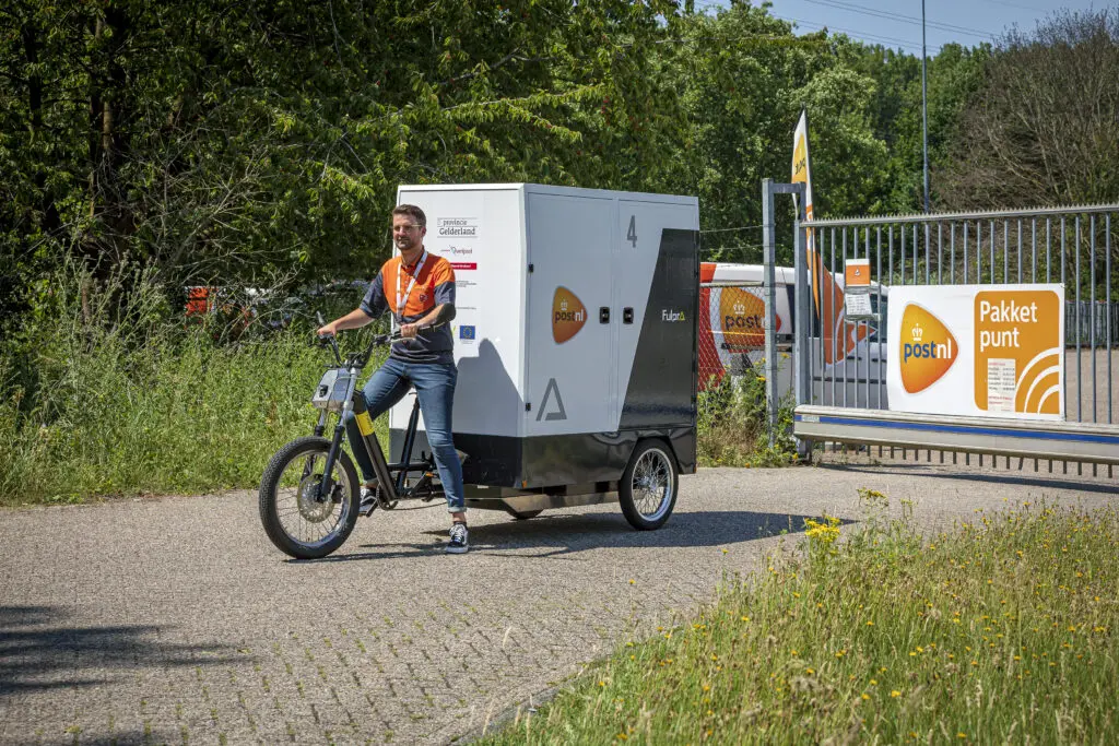 “Achter op de fiets is een gesloten kast gemonteerd met een totale laadruimte van 2,6 kubieke meter”, licht Niels Markvoort, directeur van Fulpra, toe. “Daarin passen precies twee standaard rolcontainers van PostNL, die met behulp van oprijgoten eenvoudig geladen en gelost kunnen worden. De fietsen hebben een elektrisch vermogen van zo’n 1.000 W, hetgeen ongeveer vier keer zoveel is als het vermogen van een normale, elektrische fiets. Dankzij dat grote vermogen en hun robuustheid zijn ze geschikt voor intensief zakelijk gebruik. De fietsen zijn 1 meter breed, hebben een maximum snelheid van 25 kilometer per uur en een actieradius van ongeveer 70 kilometer. De fietsen zijn voorzien van diverse sensoren en een communicatiesysteem. Zo kan de technische staat en de beveiliging van de fiets op afstand worden gemonitord en kunnen we de routes optimaliseren.”