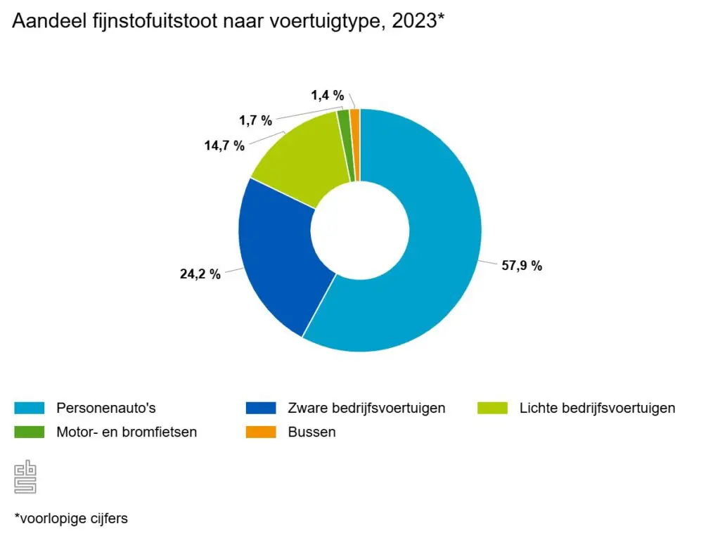 Het wegverkeer veroorzaakte 12,6 procent van alle fijnstofuitstoot in Nederland in 2023. Tien jaar eerder was dit 11,9 procent.