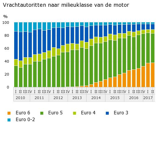 Nederlandse vrachtauto’s maakten in 2016 bijna 83 miljoen ritten. Sinds de invoering van motoren met de Euro 6-milieuklasse in 2013 neemt het gebruik van vrachtauto’s met deze motoren elk kwartaal met gemiddeld 2,2 procentpunt toe. In het eerste kwartaal van 2013 werd minder dan 1 procent van de ritten met een vrachtauto met een Euro 6-motor gereden, in het tweede kwartaal van 2017 is dit al 38 procent. Motoren met het Euro 6-label stoten 80 procent minder stikstof uit dan motoren uit de Euro 5-klasse en 97 procent minder dan motoren uit de Euro 1-klasse.