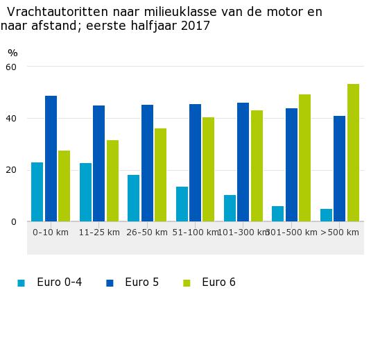 Vrachtauto’s met motoren die vallen in de klassen Euro 0–4 worden het vaakst op korte binnenlandse trajecten ingezet. Bijna een op de vier ritten over een afstand tot en met 25 kilometer wordt gedaan met een vrachtauto uit deze milieuklassen. Naarmate de ritafstanden toenemen, neemt het aandeel ritten in deze milieuklassen af ten gunste van schonere vrachtvoertuigen uit de hoogste milieuklassen Euro 5 en 6. Slechts in 6 procent van de ritten van meer dan 300 kilometer wordt een vrachtauto uit de klasse Euro 0-4 ingezet, terwijl de helft van deze lange ritten wordt gereden met een Euro 6-voertuig.
