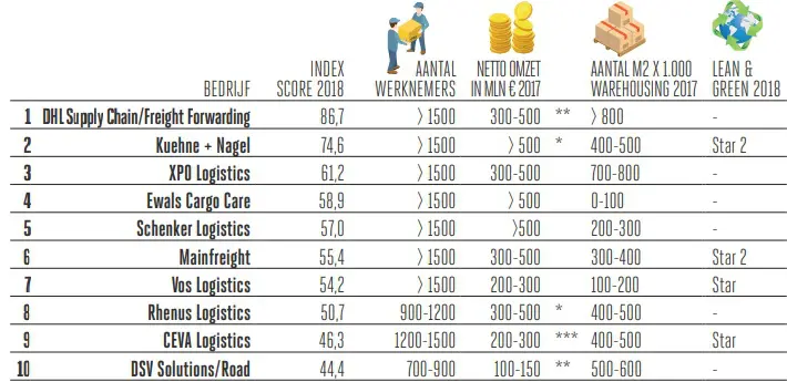 Net buiten de top 10 vallen Nederlandse bedrijven als Bakker Logistiek, Kloosterboer, Simon Loos, Bleckmann, Jan de Rijk, Nabuurs, Meuus, HSF en Wolter Koops.