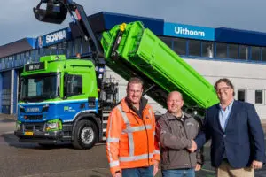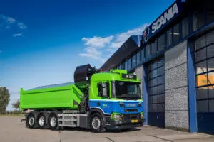 AW Groep in Lisse nam afgelopen week de eerste Scania in Nederland in gebruik die voorzien is van een elektrisch aangedreven PTO voor de cabinekraan en haakarmsysteem. AW kocht de P410 8×4/4 met hefbare en gestuurde naloopas met het oog op de steeds strenger wordende regelgeving voor het werken in binnensteden.