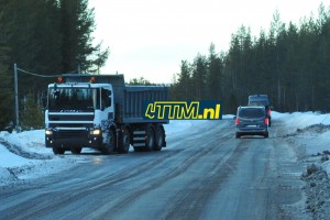 Stoppen konden we niet, want we reden in colonne naar het vliegveld van Arvidsjaur. Al eerder hadden we onder het rijden een nieuwe gecamoufleerde Scania in trekker-uitvoering gezien, maar deze 8×4 in kipper uitvoering stond langs de kant van de weg en wilde net gaan draaien toen wij langsreden. De lage korte cabine hadden we nog niet veel eerder gezien. Ondanks de beperkte hoeveelheid camouflage-stickers, is goed te zien dat de cabine zo goed als productierijp is. Ook de kipper-opbouw vertelt ons dat het niet lang meer zal duren voordat Scania met de nieuwe serie op de proppen komt. We denken dat het ‘zo goed als zeker is’ dat Scania nog dit jaar de nieuwe cabine introduceert.