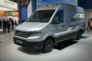 De Crafter met fuel cell is nu nog een studie. De 3,5 tons auto zou met 4,5 kilo waterstof een 320 kilometer moeten kunnen afleggen en is bedoeld voor die bedrijven die aan minder niet genoeg hebben. Met een modulair tanksysteem zou het voertuig nog eens 100 kilometer verder moeten kunnen komen. De auto heeft ook meer payload omdat de installatie maar een tiende weegt van een aandrijving met accu’s.