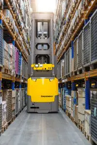 De automatische opslag van ESM Ertl Systemlogistik is gebaseerd op een ‘gewoon’ smalle gangen magazijn. De stellingen (13,5 meter hoog, 14 gangen) bieden plaats aan 13.000 pallets. Zeven gerobotiseerde smalle gangentrucks met telescoopvorken verzorgen de in- en uitslag. Het vervoer van de goederenontvangst naar het opslagsysteem vindt plaats met manuele reachtrucks.
