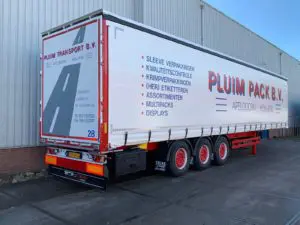 De opleggers werden geleverd met hardhouten vloer, zijborden, chassis en opbouw gespoten in kleur, lift-as op voorste as, en met verdere specifieke wensen van Pluim Transport.