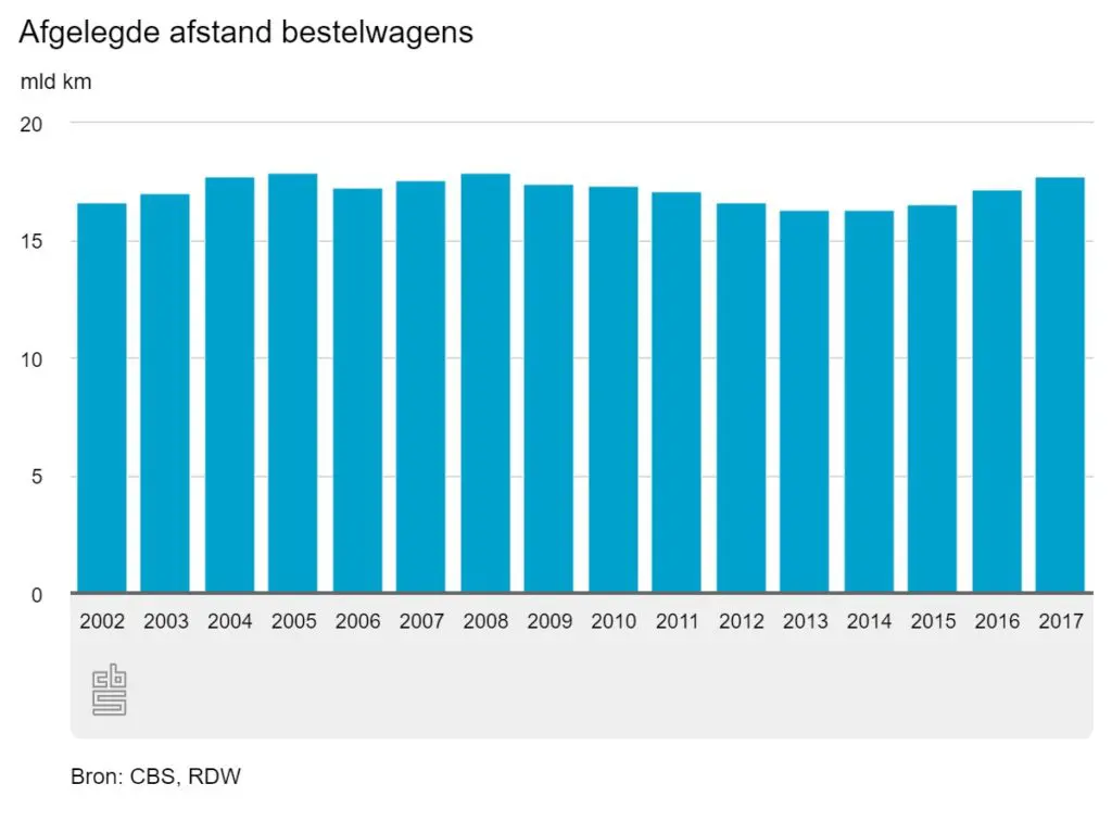 Nederlandse bestelauto’s reden in 2017 samen 17,7 miljard kilometer. Dat is 6,8 procent meer dan 15 jaar geleden. Vergeleken met een jaar eerder is er sprake van een toename van 3,4 procent. Het aantal afgelegde kilometers laat vanaf 2002 golfbeweging zien. In 2006 nam onder andere het aantal bestelwagenkilometers af. Dit had te maken met lagere verkopen van nieuwe bestelauto’s omdat medio 2005 de belastingvoordelen van een grijs kenteken voor particulieren vervielen.