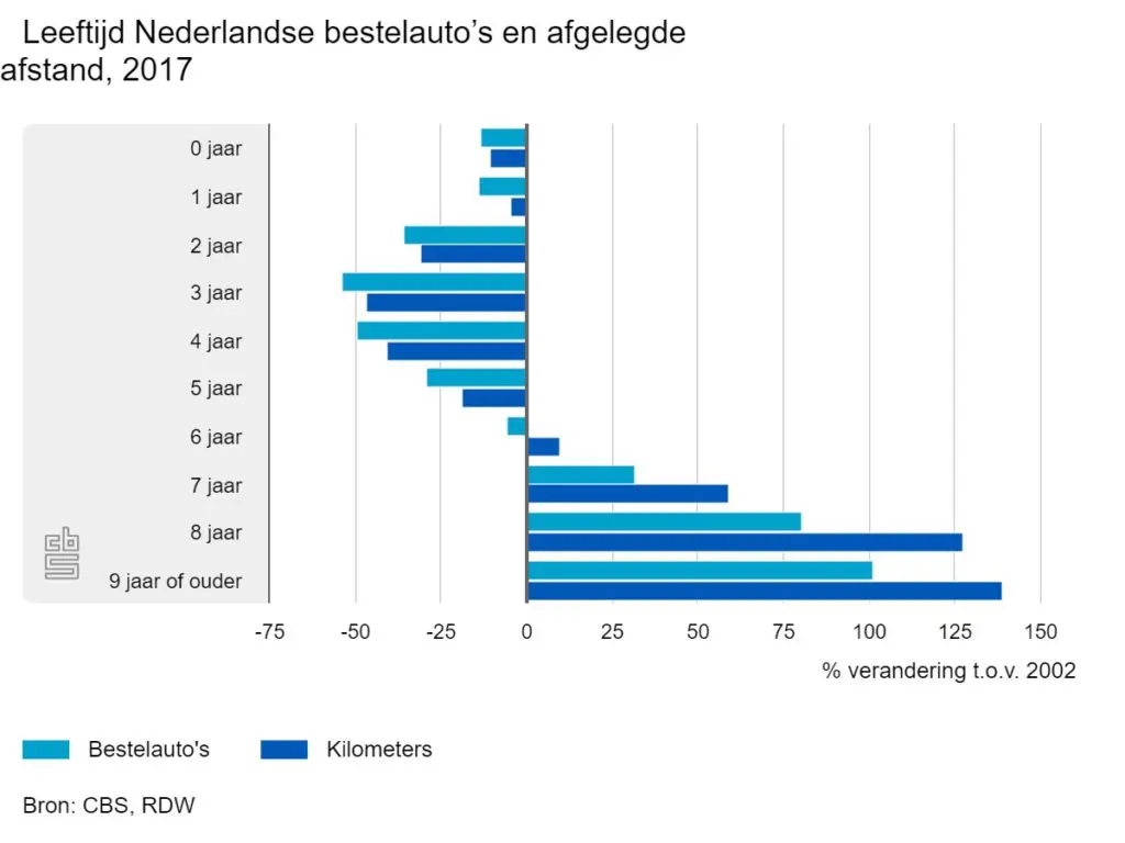 In 2002 werd 15 procent van de bestelwagenkilometers afgelegd met bestelauto’s die 9 jaar of ouder waren, in 2017 was dit opgelopen tot bijna 34 procent. Vergeleken met vijftien jaar geleden is het aantal oude bestelauto’s verdubbeld naar bijna 460 duizend. Er werden minder nieuwe bestelauto’s verkocht dan in 2002 en er wordt langer met oudere bestelwagen gereden.