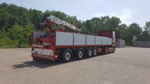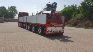 Martin Kant is al onderweg met de nieuwe Pacton-kraanoplegger. Hij vertelt: “Ik heb de trailer nu een week in gebruik en het bevalt heel goed.” De oplegger vervangt eenzelfde Kennis-kraanoplegger, veertien jaar geleden aangeschaft. De oplegger is voorzien van een eveneens nieuwe 14 ton/meter kraan. “In feite gaat het om exact dezelfde trailer en kraan, met een iets andere besturing en zo veel mogelijk lichtgewicht. Daartoe heb ik tevens gekozen voor onder meer een demontabel aluminium kopschot, aluminium Kinnegrip rongen, aluminium zijborden en zijafscherming én aluminium velgen. Zo houden we meer laadvermogen over en in combinatie met de liftbare eerste en tweede as is de trailer optimaal ingericht voor deelladingen.”