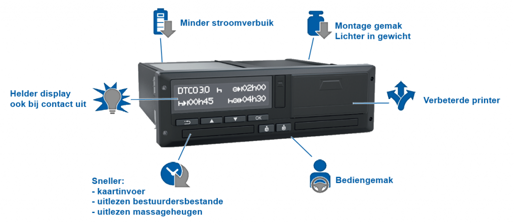 De digitale tachograaf (DTCO) 3.0 is verbeterd op maar liefst zes gebieden. De weergavekwaliteit is hoger, de flexibiliteit groter en het verwerken van de data gaat sneller en gemakkelijker. Daarbij verbruikt het apparaat aanzienlijk minder stroom dan zijn voorganger (DTCO 2.2). Chauffeurs zullen de snellere verwerking van de data weten te waarderen (bijvoorbeeld bij tweepersoons bemanning) en kunnen diverse tachograaffuncties bekijken en gebruiken vanaf hun smartphone. Dit maakt het gebruik overzichtelijker, directer en belangrijker nog: vermindert het risico op (dure) fouten. De koppeling van tachograaf naar de mobiele telefoon was al mogelijk met de DTCO 2.2 maar is nu verder verbeterd.