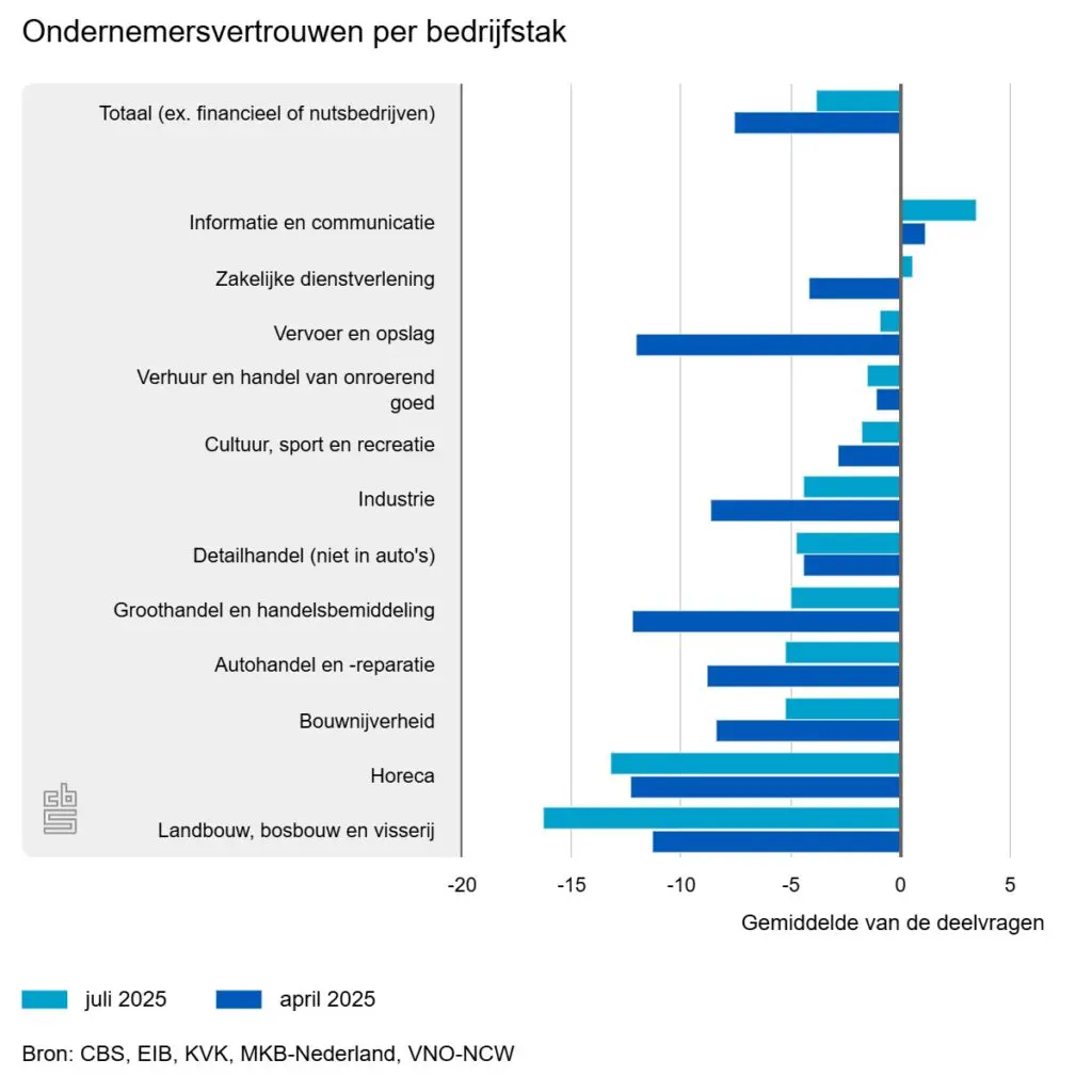 Het ondernemersvertrouwen is gestegen en komt in het derde kwartaal van 2025 uit op -3,8. Vooral in de vervoer en opslag en de groothandel en handelsbemiddeling steeg het vertrouwen. Toch ervaren ondernemers iets vaker belemmeringen en zijn zij verdeeld over investeringen in 2025, al is ook hier de vervoerssector positief. Dit melden het CBS, de KVK, het EIB, MKB-Nederland en VNO-NCW op basis van de Conjunctuurenquête Nederland die in juli is gehouden.