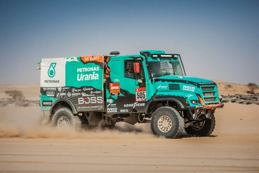 Een lekke band, een klapband en een heel zachte duin vormden de belangrijkste obstakels voor Janus van Kasteren in de lus rond Wadi Al-Dawasir. De eerste lekke band kwam al op 30 km. Daarna kwam de Iveco Powerstar ‘vierkant vast’ te zitten op een duin. “Mijn eigen stomme schuld”, bekende Van Kasteren. “Daar hebben we 25 minuten op verloren. Ik hoopte dat Vick kort achter me zou zitten, maar die had zelf problemen. Jan van de Laar heeft me losgetrokken, nadat een aantal andere Nederlanders waren doorgereden. Gert Huzink stond op ongeveer hetzelfde punt vast.”