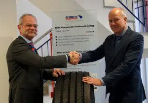 Dr. Peter Hendrik Kes (links op de foto), CEO van Cargobull Parts & Services GmbH en René van Maasakkers, directeur van Profile Tyrecenter Europe, zetten onlangs hun handtekening onder de samenwerkingsovereenkomst. “Schmitz en Profile zijn al enkele jaren succesvol partners van elkaar en we zijn blij dat de klanten van Profile nu nog betere dienstverlening krijgen dankzij onze Cargobull banden!”, aldus een verheugde Kes. René van Maasakkers was al net zo blij: “Als marktleider voor opleggers, met een groeiend aantal servicecontracten is Schmitz Cargobull voor ons een belangrijke strategische partner. Zij gelooft net als Profile in kwaliteit, topprestaties en een uitstekende dienstverlening.”