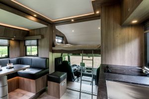 Dat de keuze viel op de Volvo FE, kwam in eerste instantie door de reputatie van de automatisch schakelende Volvo I-Shift versnellingsbak, vertelt Joey van der Ham: “De veiligheid en het comfort van de pony’s onderweg staan voorop, vandaar dat soepel schakelen een must is”, legt hij uit. “Door Volvo I-Shift trekt de truck heel gelijkmatig op. In samenspraak met Volvo Group Truck Center en RC Horsetrucks kwamen we uit op een Volvo FE vanwege de lage, compacte cabine, waar nog een tweepersoons slaapgelegenheid boven gebouwd kon worden en er veel ruimte overbleef voor de living.” De truck is voorzien van een uitschuifbaar zij- en dakdeel, waardoor een grote leefruimte kan worden gecreëerd met nog eens drie slaapplekken.