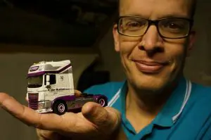 DAF’s verzamelen wel. Maar voordat we naar het ‘heilige der heiligen’ op zolder mogen, eerst die ene prangende vraag: waarom DAF? En geen Scania, of Volvo? “DAF is een Nederlands product natuurlijk. En de kwaliteit van de vrachtwagen, die is gewoon beter. Ze zijn stiller ook”, declameert Jansen. Hij bladert door een oude editie van TTM.nl en komt een foto van de nieuwe generatie Scania tegen. Hij bromt afkeurend. “Kijk nou naar die lampen en die lijnen van die Highline cabine. Gewoon gejat van de CF.”
