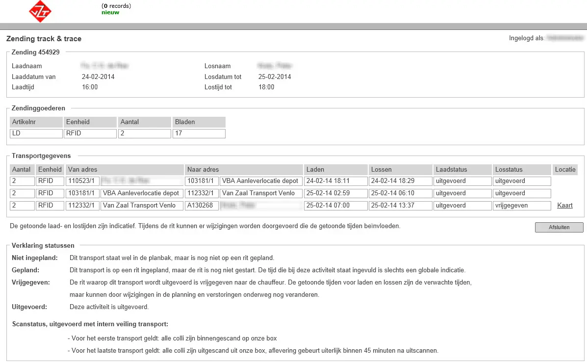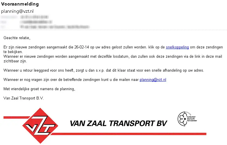 Gelijktijdig met NaviTrans implementeerde Van Zaal in 2012 ritplanningssysteem ORTEC Routing & Dispatch (voorheen TD) en Transics boordcomputers. De 50 eigen wagens zijn uitgerust met een TX-MAX, terwijl alle charters werken met de TX-SMART app. Uit deze drie systemen haalt Van Zaal de informatie voor een gedetailleerd statusoverzicht voor klanten. “Elke klant krijgt dagelijks een mail met de orderbevestiging en een link”, vertelt Van Zaal. Deze link geeft toegang tot het statusoverzicht, dat laat zien hoe laat de order is ingevoerd, gepland, afgehaald, gecrossdockt, gependeld van veiling naar veiling en afgeleverd bij de klant. Ook de eindontvanger krijgt een mail met link. Van Zaal: “Per dag sturen we één overzicht waarin staat welke leveringen van welke opdrachtgevers hij die dag van ons krijgt en hoe laat hij die kan verwachten.”